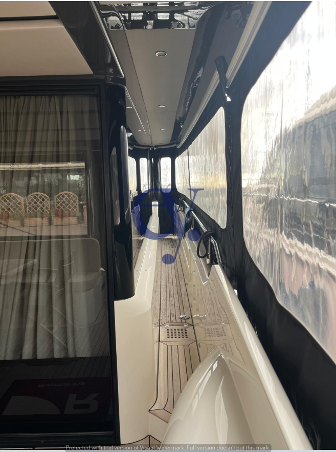T-Top – Electric winch – Aft mooring winch – Trim tab indicators – Swimming ladder – Anchor – Water pressure system – Shore water inlet – Electric windlass – 220V shore power outlet – Entrance door – Side door – Fixed aft lights – Dual helm station – Stabilizers: Gyro 5 Seakeeper – Cockpit table – Horn – Electric bilge pump – Underwater lights – Platform – Special paint: red – Battery charger – Chain wash system – Batteries –Fire emergency system – Generator – Gangway – Outdoor shower – Electric flaps – Shore power cable – Courtesy lights – Camera – Internal 220V sockets – Inverter – Boiler – Air conditioning – Wooden interior flooring – Black water system – Watermaker – BBQ/Grill – Electric marine toilet – Black water tank – Stereo – TV system – Speakers – TV lift mechanism – Teak decks
