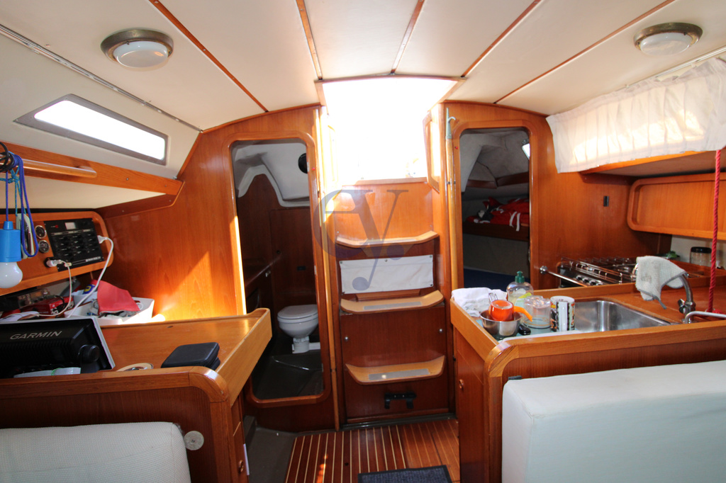 Dinette, L-shaped galley, chart table, double cabin in the bow, double cabin in the stern, bathroom with marine toilet and shower